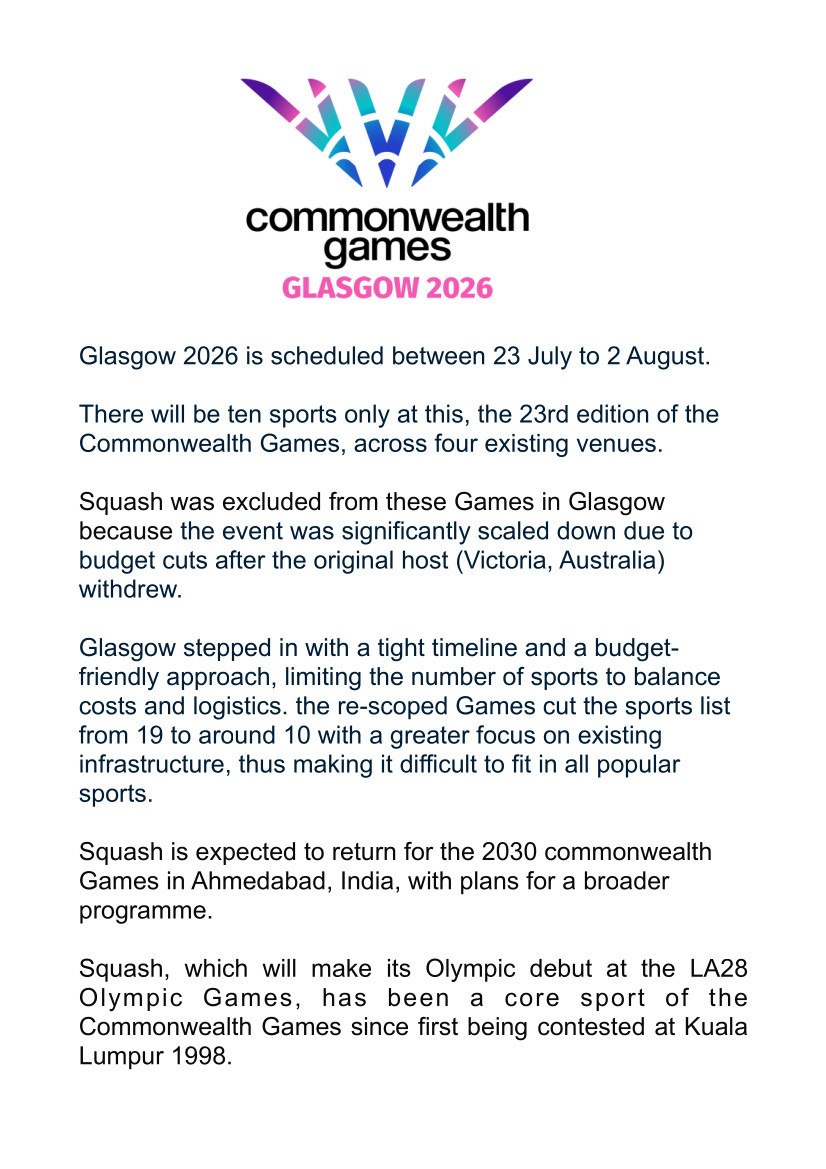 The Glasgow Games are scheduled from 23rd July until 2nd August 2026 but will feature a much reduced 10-sport programme. Sadly, this means it will not involve several established Commonwealth sports, including Squash. This is hugely disappointing news as we try to grow the sport, particularly as all of the Glasgow squash facilities are already in place.