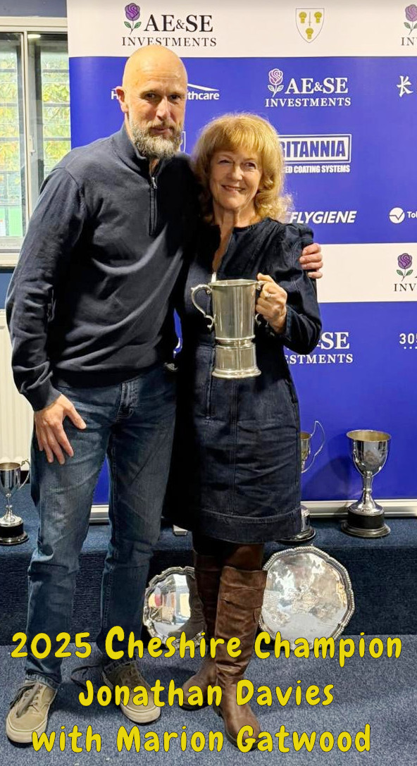 JD was not the first WBSC member to become the Cheshire O50s Mens Champion - it had been won previously by Pete Lee, back in 1996. JD was presented with The Nick Gatwood Trophy by Marion Gatwood (see below).